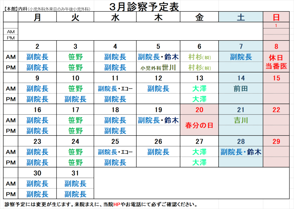 【本館】外来担当表